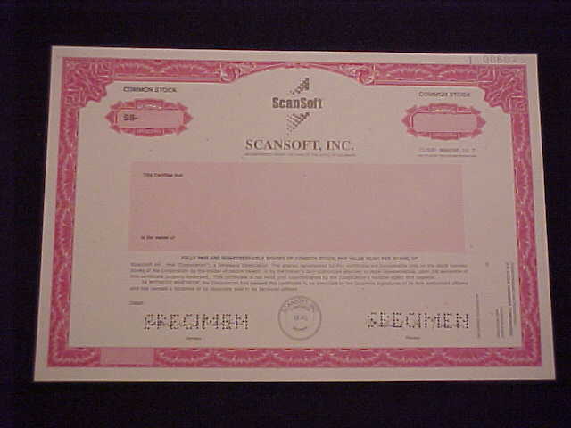 ScanSoft Inc Stock Certificate Specimen Normal Price $25 Sale Price $21 |